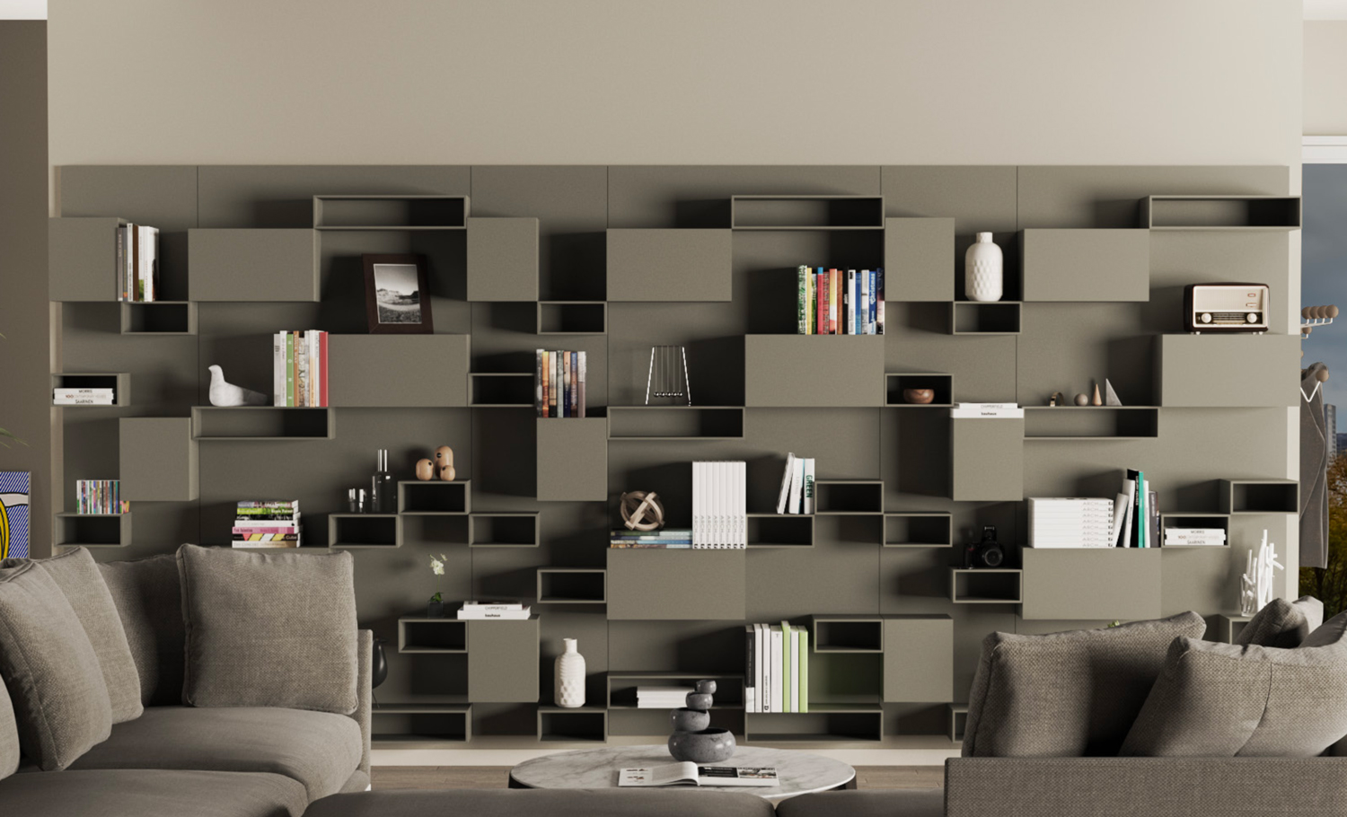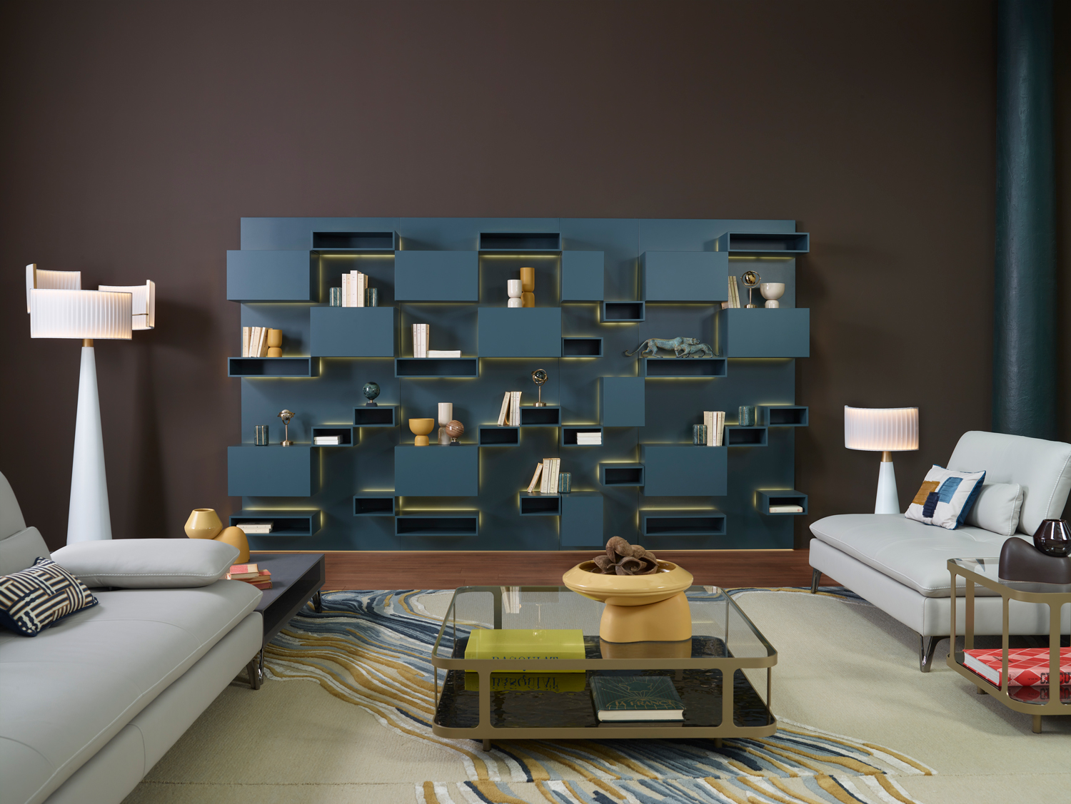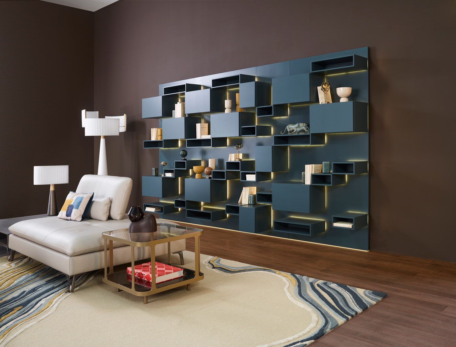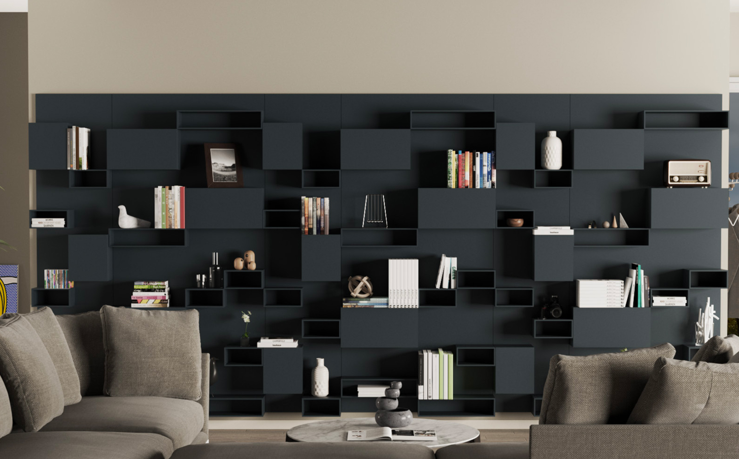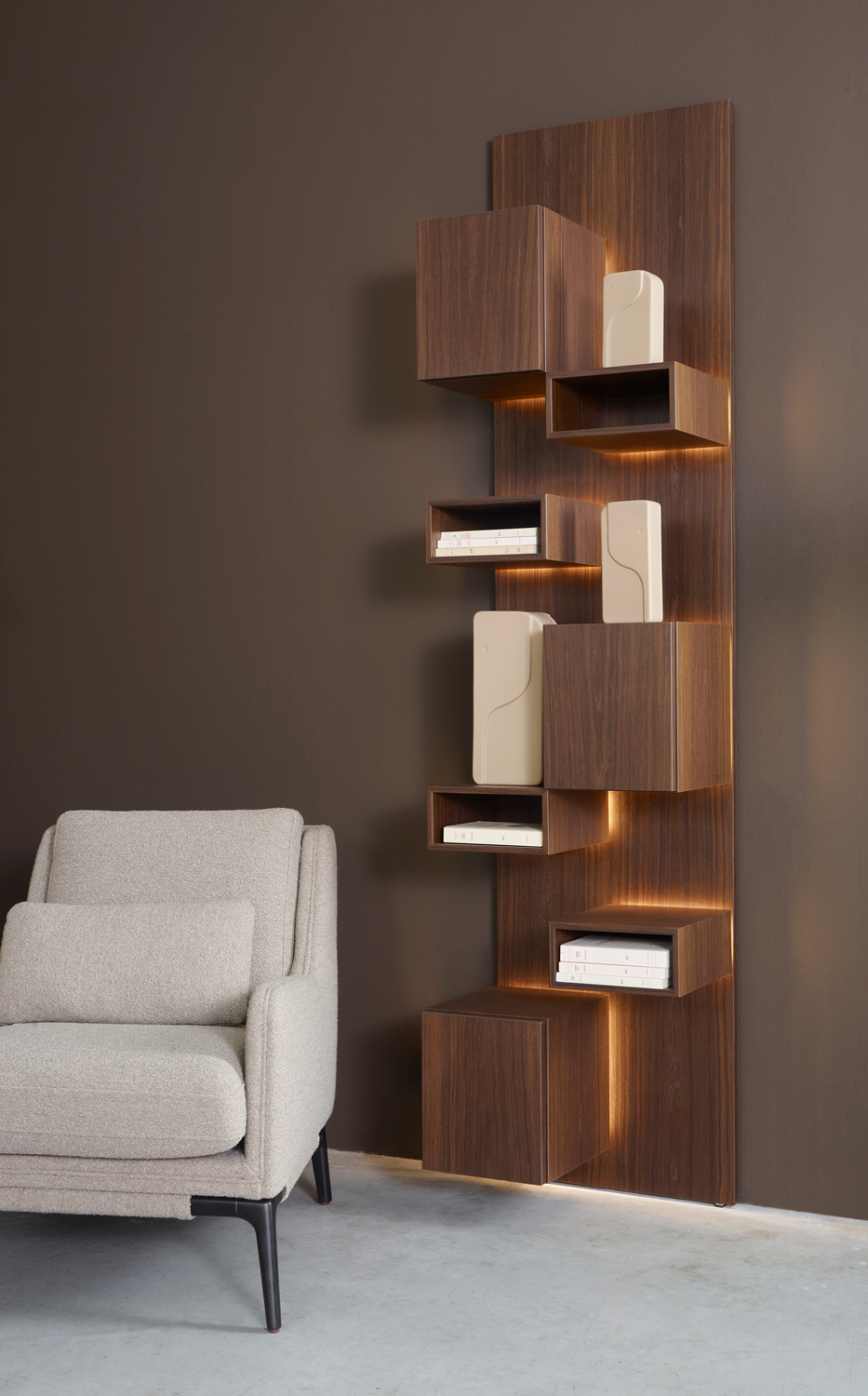 The DEEP bookcase strikes a lively balance between function and geometry, alternating between open shelves and storage compartments. Each of the cubicles seems separated from the supporting panel: the lighting casts a shadow that creates a floating effect. Modules of 50 or 100 cm can be arranged in endless configurations.