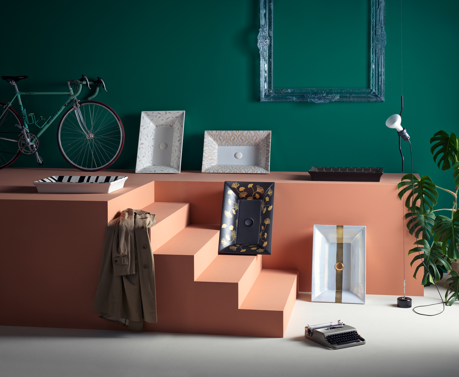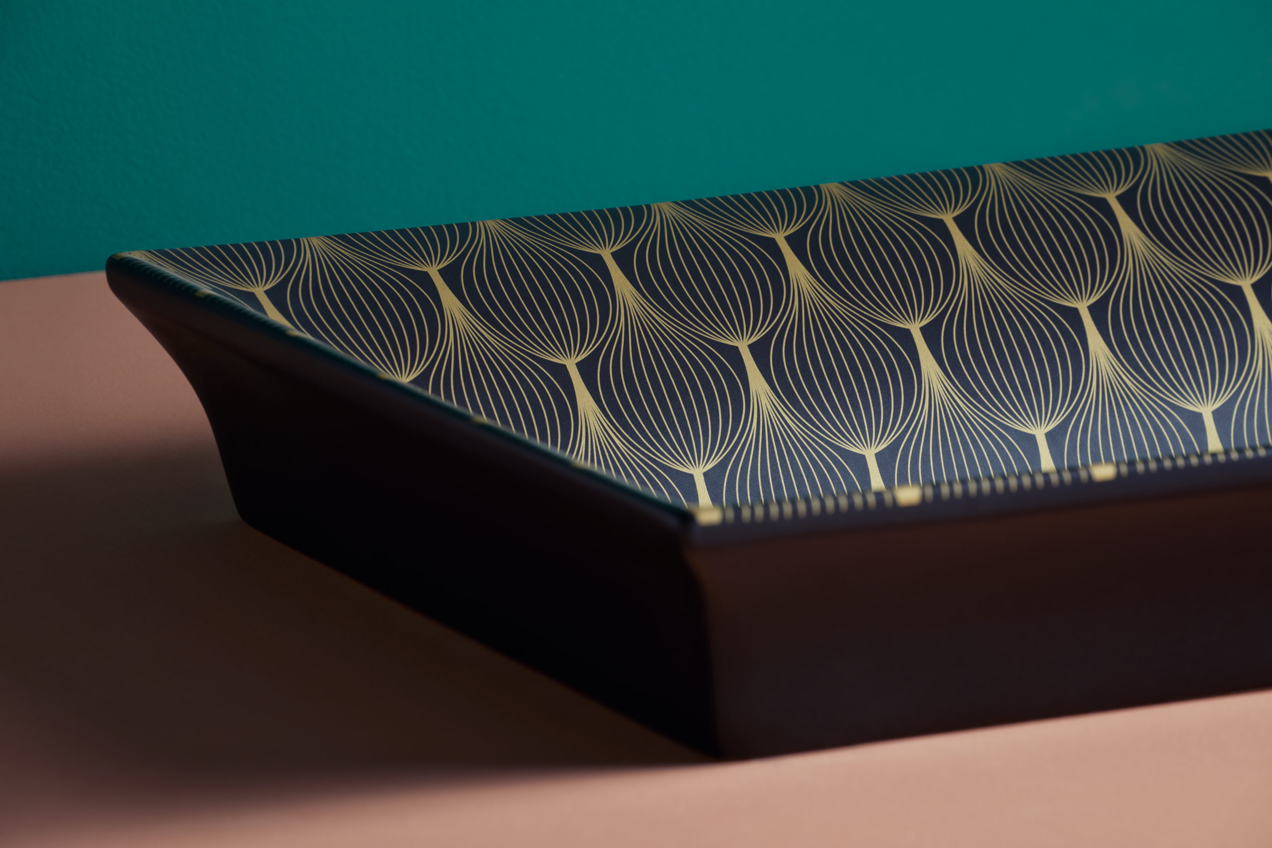 Fine fire-clay of the highest quality hand-cast Like a rich oriental fabric, Manatares shines brightly: thanks to the refined palette and the glazing that embellishes the slightly raised decorations. The classic, rigorous shape enhances the fine finish. Glossy or matte glazes accommodate highly refined decorations in design and materials: from the geometric rigour of black and white or gold, to oriental reminiscences of golden inflorescences, Manatares comes alive in seven precious and regal versions.