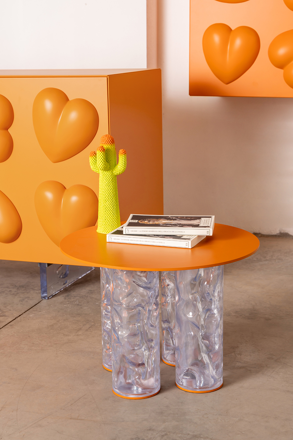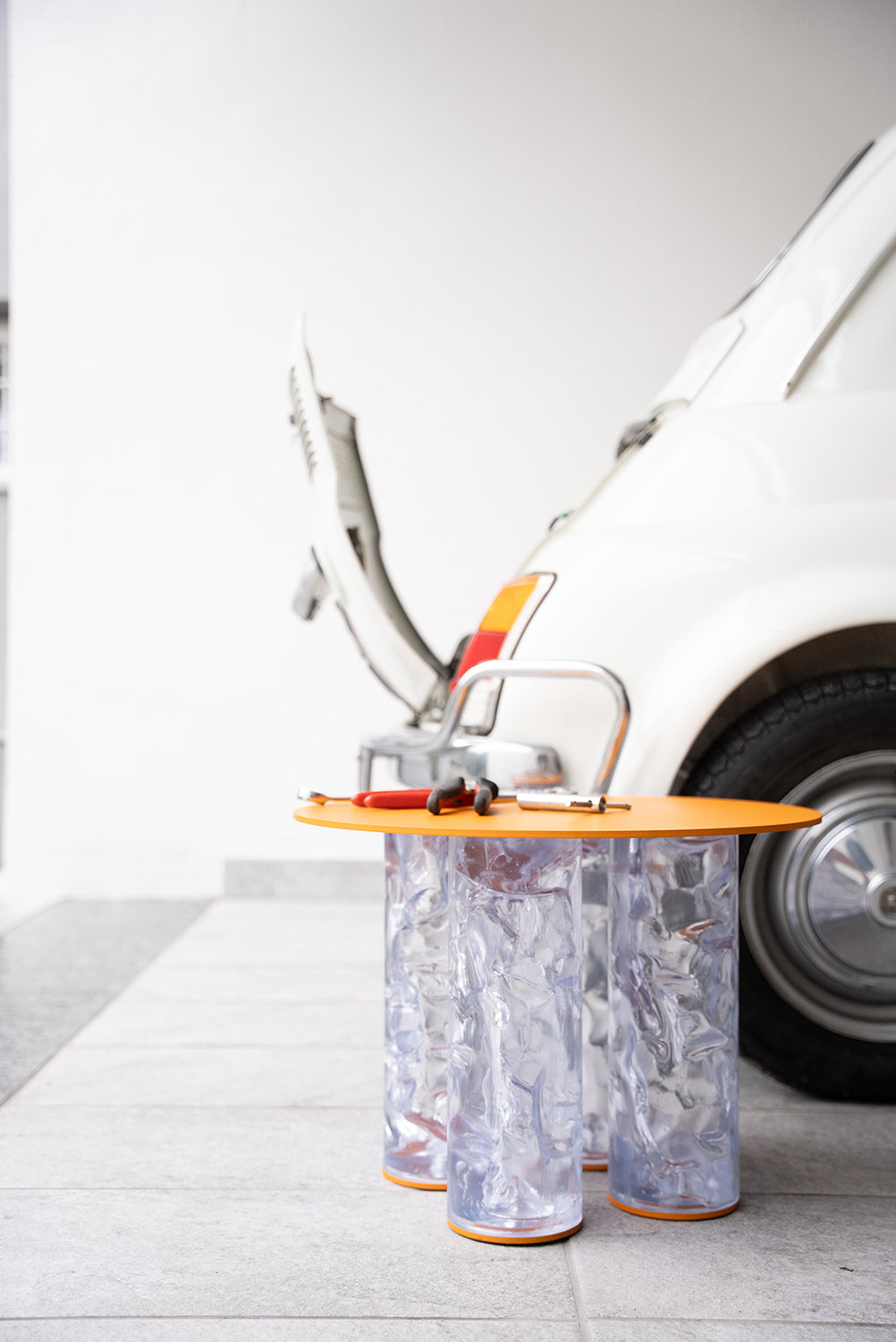 Four columns of “ice” support a painted metal disk. Pop appears light, as if the piano were levitating in suspension.