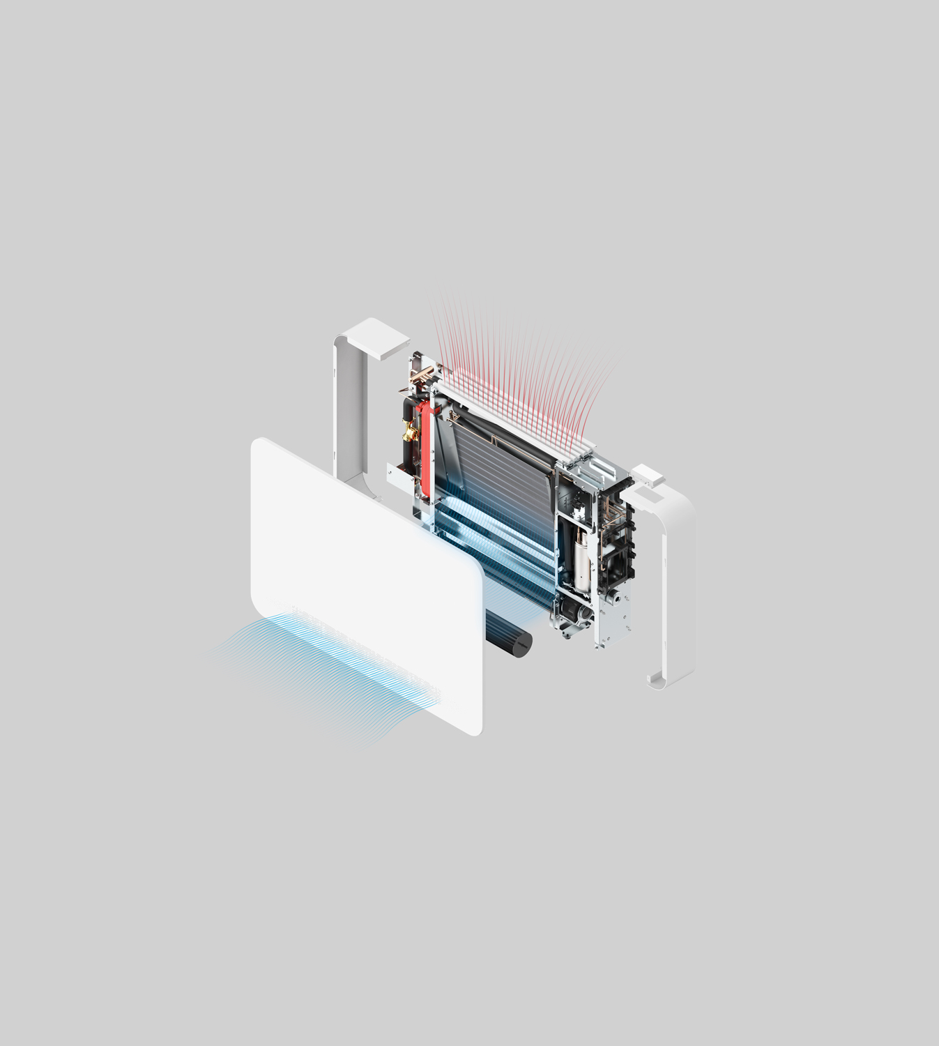 WLHP is a range of compact and efficient water/air heat pump terminals to be installed in any room as a replacement for radiators. The water in the system will be circulated all year round at a neutral temperature (20-30 °C), thus avoiding condensation in summer on uninsulated pipes-it will be WLHP that will bring the water temperature to the optimal level so that each individual room can be heated or cooled.